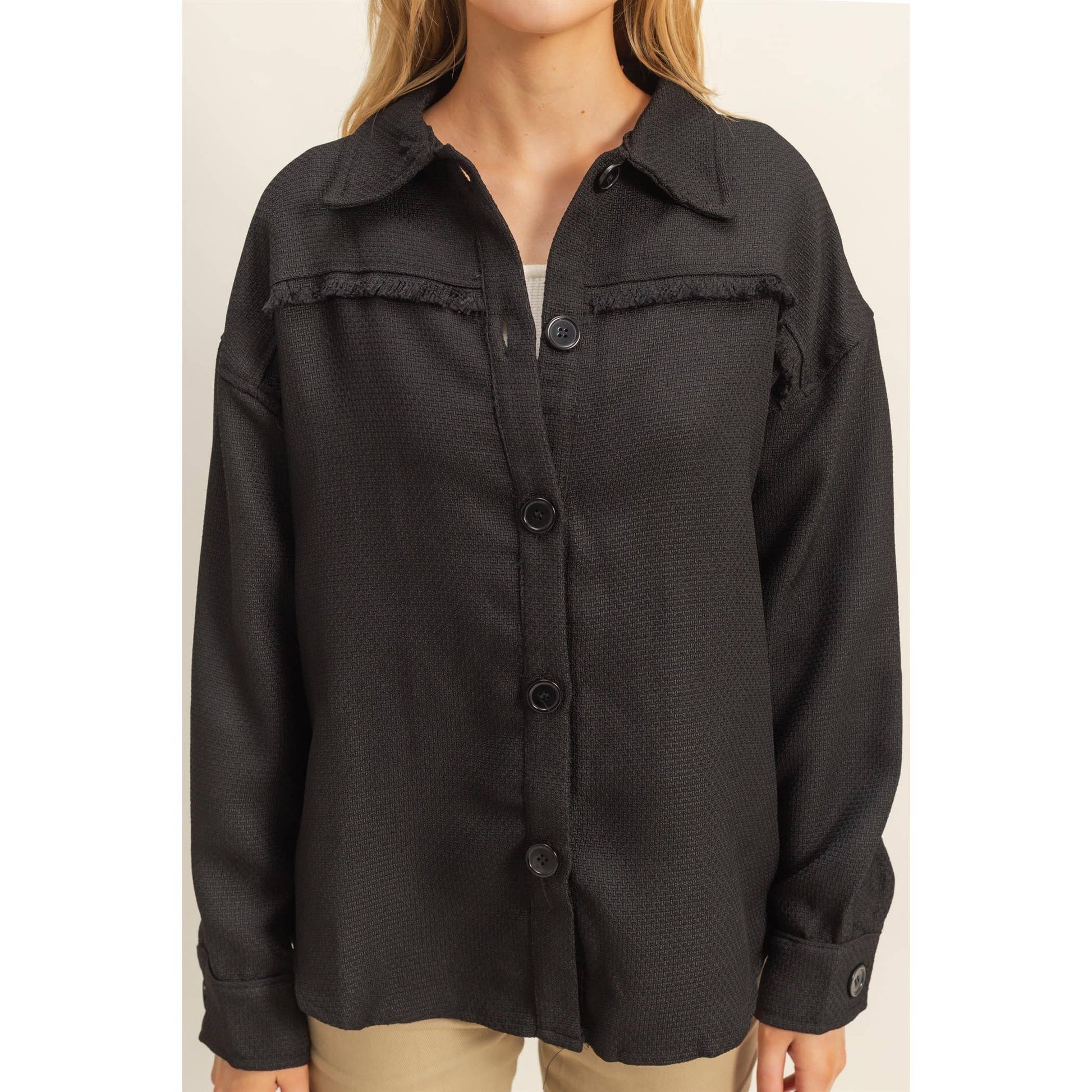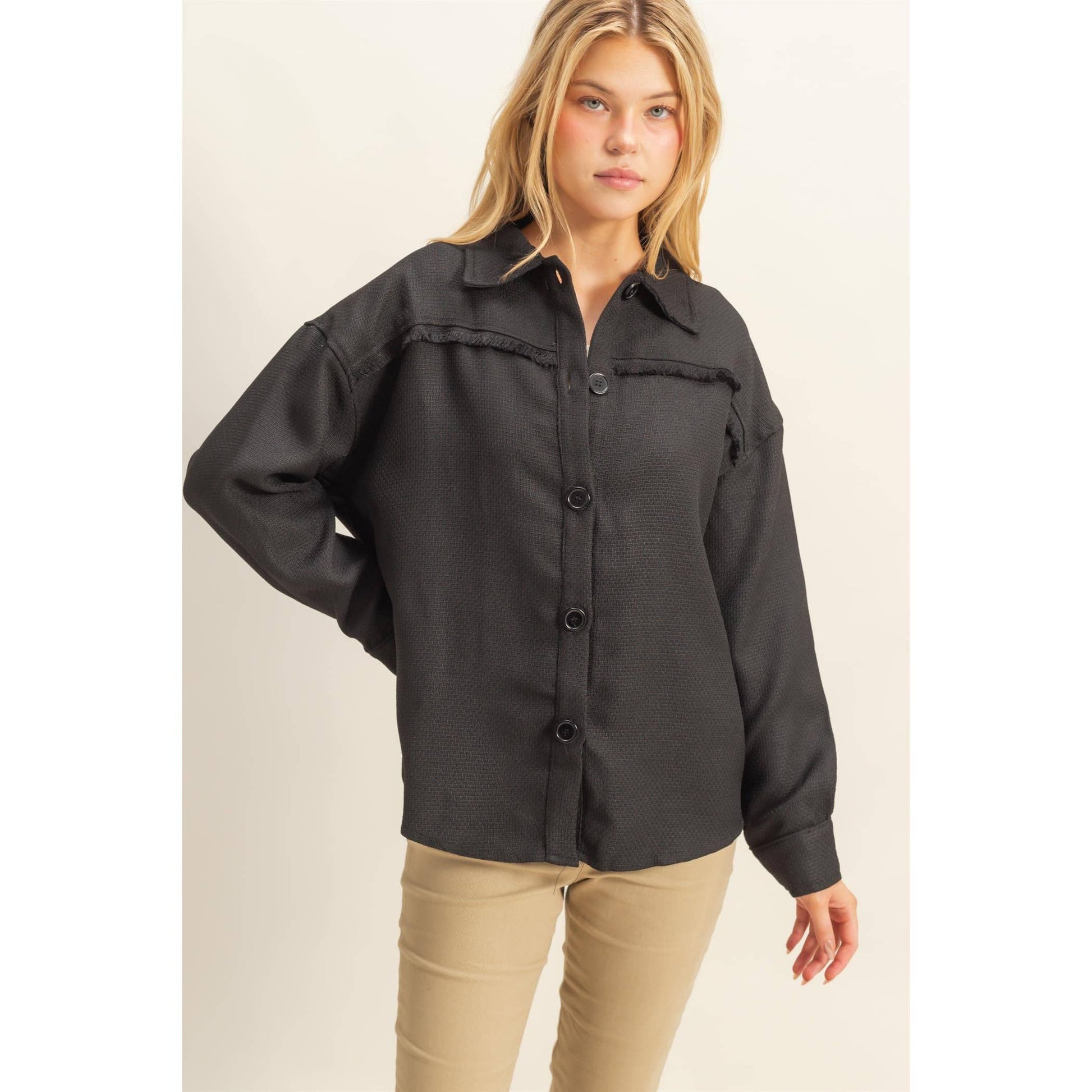 The Point Collar, Drop Shoulders, Long Sleeves And A Button-Front Bodice Create A Sweet And Sophisticated Look. Plus, The Frayed Trim Detailing Adds An Eye Catching Touch. 100% Polyester Model Is 5' 7" Tall, 32" Chest, 25" Waist And 35" Hips And Wearing A Size Small Imported. Designed in the USA
